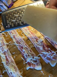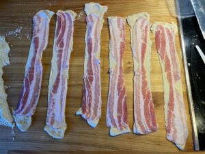 Rul en omgang pizzadej tynd og skær i lange baner (så de passer med at være lidt større end en skive bacon).